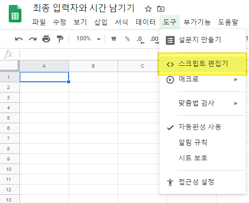 스프레드 시트에서 [도구] > [스크립트 편집기] 실행하면 된다.