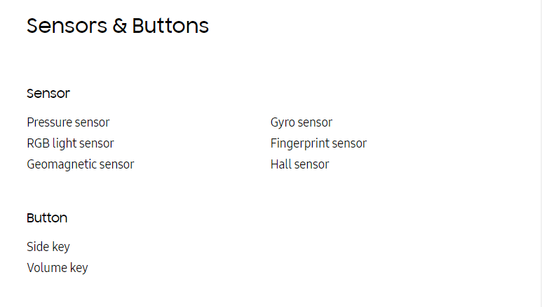 | Sensors | Optical Fingerprint Sensor, Accelerometer, Gyro Sensor, Geomagnetic Sensor, Hall Sensor, RGB Light Sensor | |