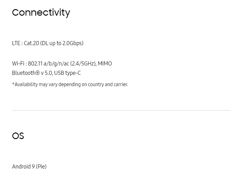 | Connectivity | Wi-Fi 802.11 a/ b/ g/ n/ ac 2.4G + 5 GHz, MIMO, Wi-Fi Direct, Bluetooth® 5.0 | |