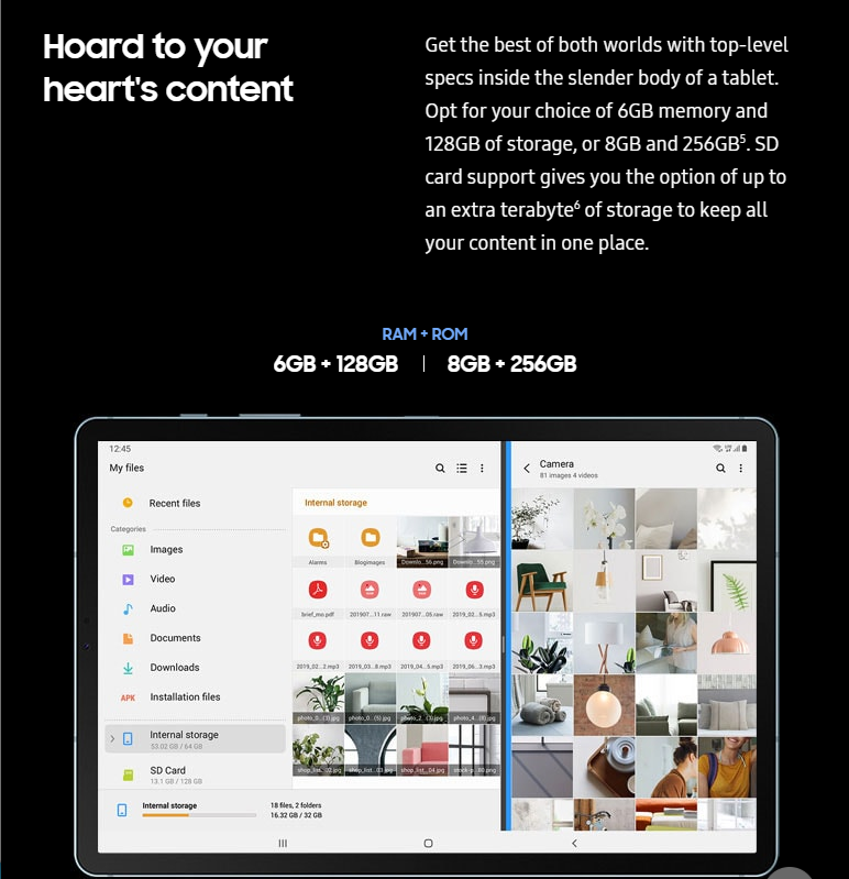 10.5" 와이드 화면(16:10), wifi 지원하는 s-pen, 7040mAh 배터리, 6기가/8기가 메모리, LTE 등...