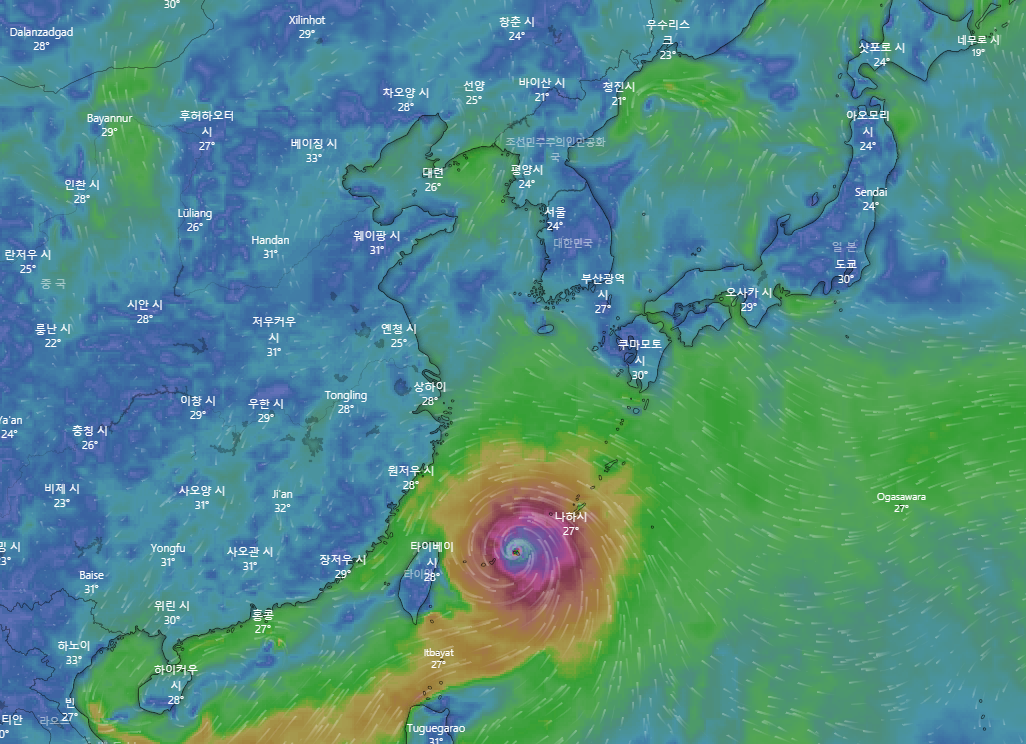 태풍 닝닝의 실시간 바람 모양이랑 위치에요.
