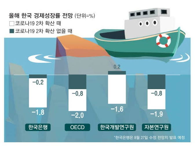 8월 중순부터 시작된 코로나19의 재확산 영향으로 한은이 지난 5월에 전망한 -0.2%의 성장률은 고수하기 어렵게 되었다. 만약 이 확산세가 약해지지 않으면 -1.8%까지 떨어질것으로 예상하기도 한다.