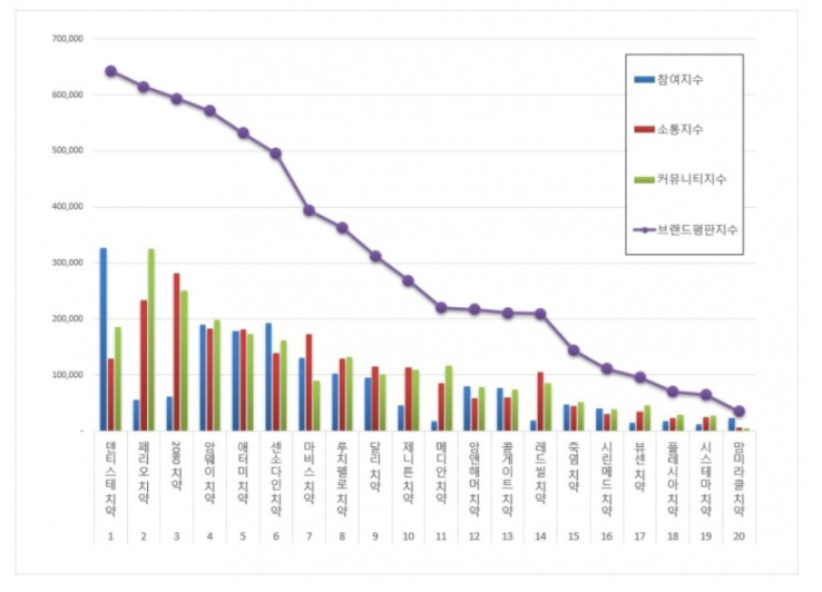 순위는 덴티스테, 페리오, 2080, 암웨이, 애터미, 센소다인, 마비스, 루치펠로, 달리, 제니튼, 메디안, 암앤해머, 콜게이트, 레드씰, 죽염, 시린메드, 뷰센, 플레시아, 시스테마, 맘미라클 순으로 분석되었다.