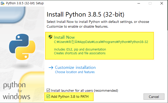 아래쪽에 Add Python 3.8 to PATH 를 체크해 준 다음