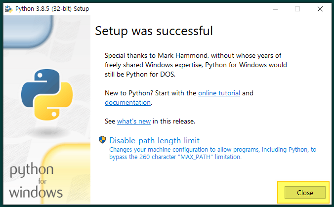 파이썬은 파일 자체가 아주 작기 때문에 금방 설치가 됩니다. 설치가 완료되면 close로 종료시켜 주세요