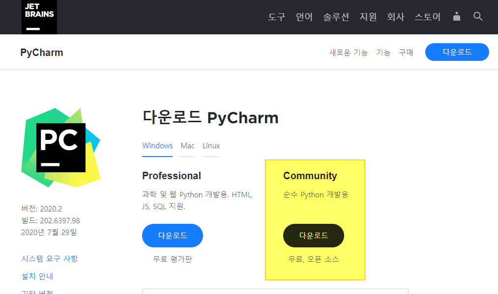 https://www.jetbrains.com/ko-kr/pycharm/download/#section=windows