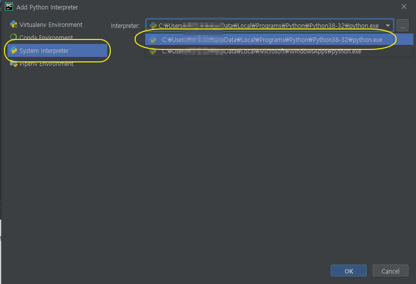 좌측에 System interpreter 선택하고, 우측에서 앞에서 설치한 파이썬을 선택해 줍니다.