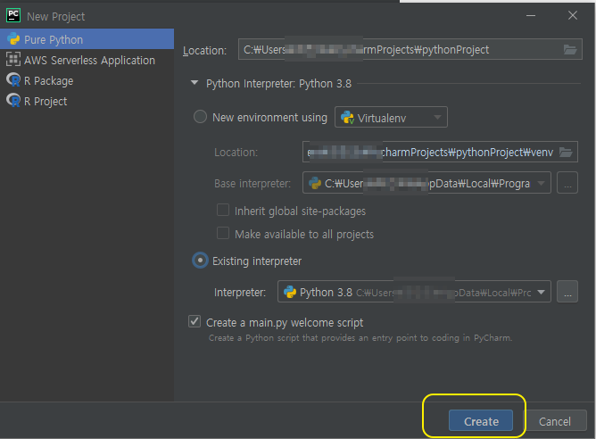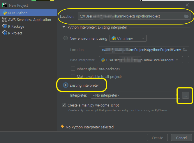 Existing interpreter를 선택해주고, 오른쪽에 ... 을 눌러줍니다.