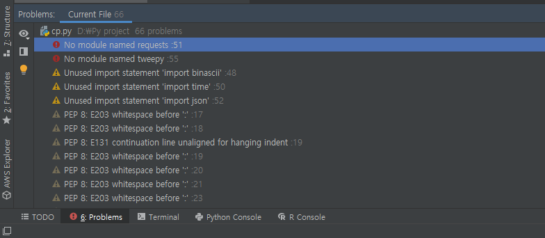 Problems : 열려있는 파일의 문제점을 표시해주는 부분 입니다.
