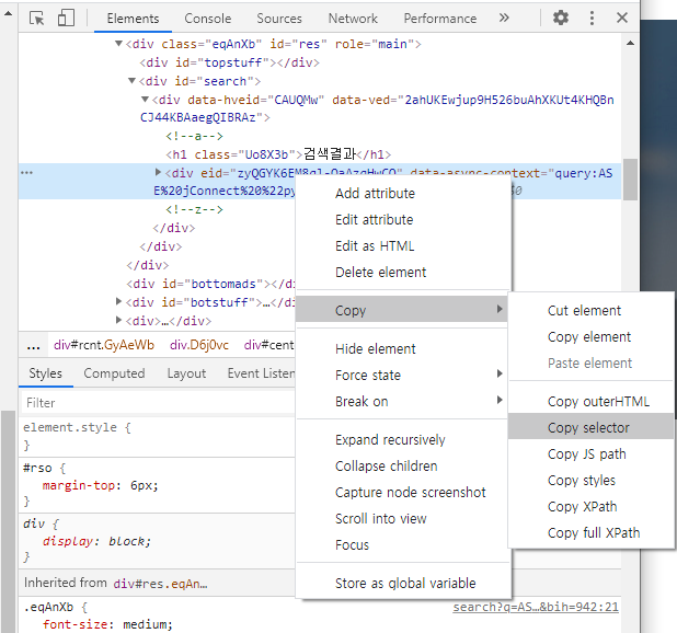 나 역시 개발자 도구를 사용해서 "Copy selector" 를 사용하는데, 사용하다 보면 오류가 난다.