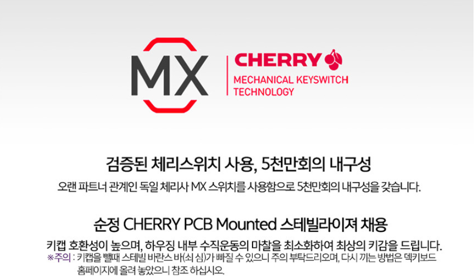 기계식 키보드의 핵심기술은 스위치죠. 그중 가장 으뜸 스위치는 체리스위치로 알고 있는데요, 정방향 정품 체리 스위치를 사용하여 키감이.. 우왕굿.