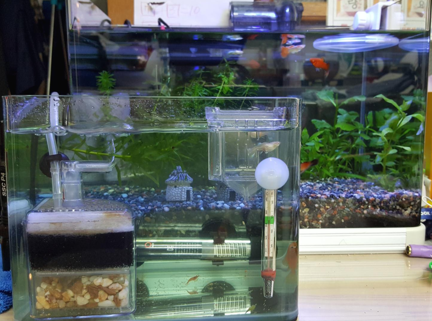 지금 새우가 살고 있는 38cm어항이 있고, 구피 치어들이 상고 있는 20cm 어항이 있다.
