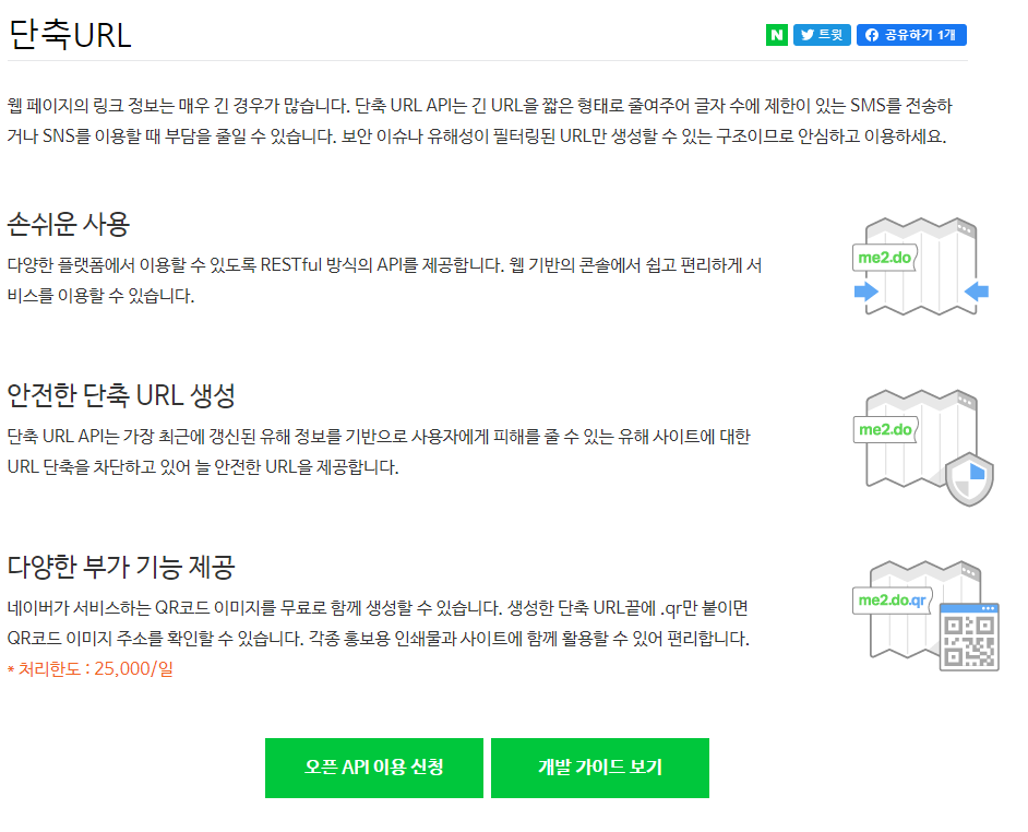 단축URL 웹 페이지의 링크 정보는 매우 긴 경우가 많습니다. 단축 URL API는 긴 URL을 짧은 형태로 줄여주어 글자 수에 제한이 있는 SMS를 전송하거나 SNS를 이용할 때 부담을 줄일 수 있습니다. 보안 �